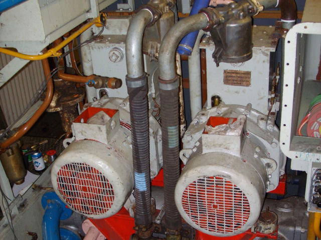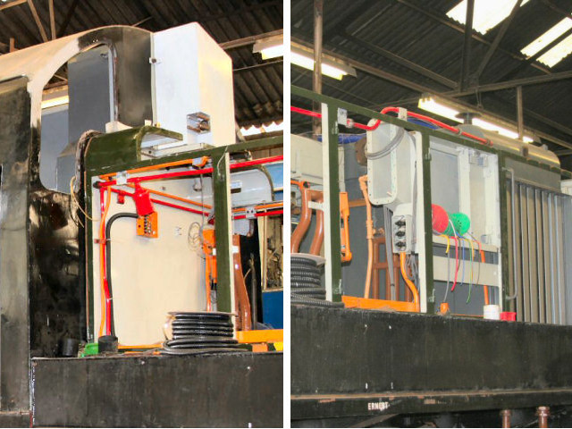 The transmission heat-exhanger was stripped down and rebuilt, all tubes were cleaned then a water test and a repaint before refitting. The engine oil priming pump was stripped, cleaned, anti-tracked, painted, tested and refitted with new flexible pipe for the oil system installed along with modifications to, or new, unions etc where required. Matching refurbished vacuum exhausters, ex-class 47, are installed, with the necessary framework acquired from the Nene Valley Railway. These sit above the transmission heat-exchager.
