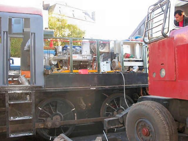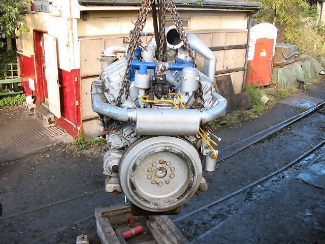 The refurbished power unit being craned across to the loco ...