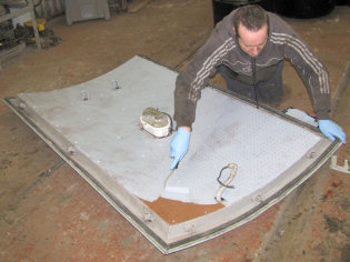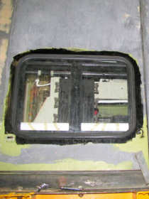 The decision was made to cut a new piece of pegboard for the cab roof section, as the hole for the conduit for the cab light was in the wrong place. An alternative bulkhead light unit was located as well. The seal on the roof section was also found to be out of tolerance, so it was decided to utilise some left over rubber section on this. Chris set about the long task of scraping out the old seal and as much glue as possible.