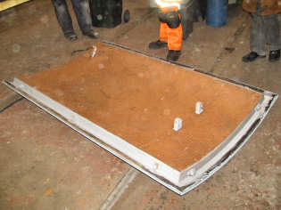 Rob Mason arrived early evening and cut a new piece of pegboard for the cab roof section, using the old as a template but relocating the slot for the conduit. Chris finished scraping out the old seal, located the new rubber and some evo-stick grip glue. Once the channels had been wire brushed, Adam and Chris cut seals to length and began sticking them down to the frame.