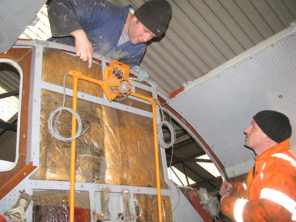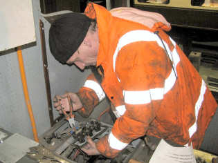 The main aim for today was to get 'Ernest' moving under its own power. In freezing temperatures that were only amplified in the C & W depot, the team made an early start. Jason began by cutting a aluminium heat shield for one of the heaters and a new sideplate to replace one that was missing. Alan was busy in the cab making further wiring adjustments.