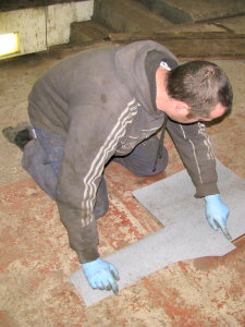 Adam cutting lino pieces for the cab floor
